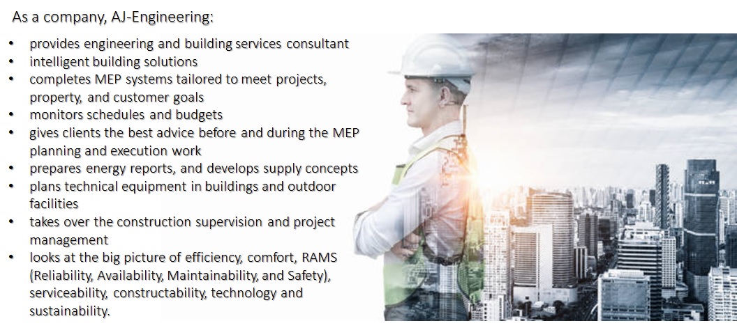 Our specialist include HVAC services, Smart Home, Air and Water management and treatment, Infrared Heating, MEP design and installation, energy audit and solutions, maintenance and repair, project management, consulting, contracting, and training.